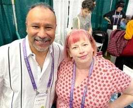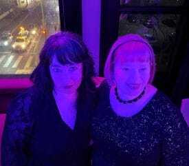 Lee Horikoshi Roripaugh and I at the Moon City Reading, Day 1 of AWP: Purple Light