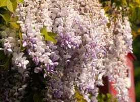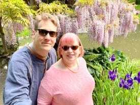 Here is Charlotte, a hummingbird, frilled iris, and blooming wisteria.