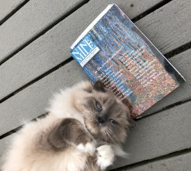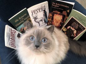 So the one thing I didn’t stop doing when I thought I was dying was writing. I’d finished the first draft of my sixth manuscript in six months. And I really didn’t stop doing most things – although it was certainly interrupted by a lot of unpleasant tests – but I signed the mortgage on my house, I brought home my re-homed delinquent kitten Sylvia (who to this day I call my “cancer-curing” kitty.) Here she is posing with all my poetry books to date.