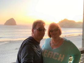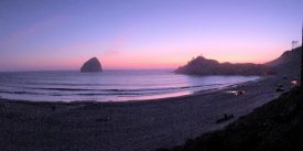 Just returned from the Oregon Coast – Pacific City, to be exact – where we had this review of a giant sand dune and Haystack Rock each morning and evening from our balcony. Pacific City – which can be reached only with a five and a half hour drive, the last hour of which was a hairpin turned, one-lane bridged mountain road driving – complete with washed-out roads and steep drop offs – almost reminded me of driving through the mountains in Tennessee only to wind up in California. The rocky dunes and steep cliffs, the scrub brush, the surfers – definitely echoed the beaches in northern California. Maybe a little like Big Sur – the lush growth of mountain trees, ending in a spectacular stretch of beach.