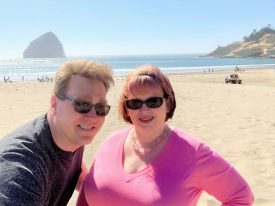 Glenn and I on the windy beach, where it was really hard to walk with a cane!