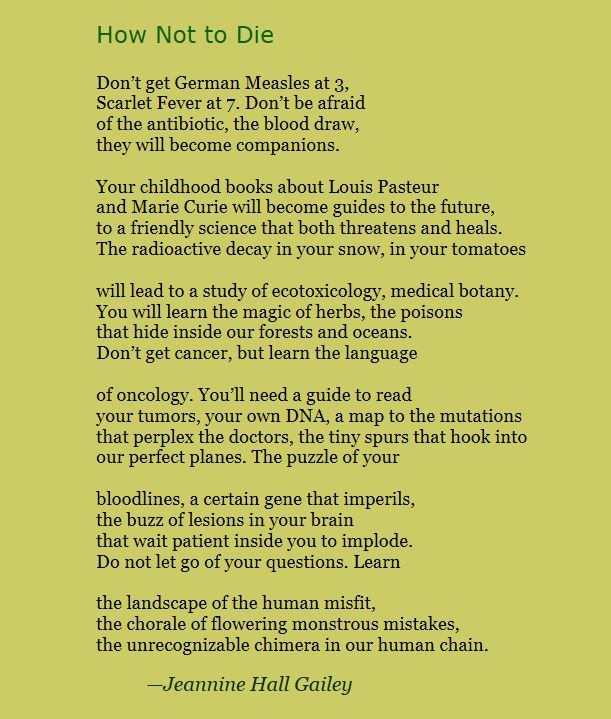 I was pleased to have a poem in the new issue of Eye to the Telescope. This theme was “infection” and I share the issue with my friend Karen Weyant. My poem is “How Not to Die,” a subject I happen to know a little about. Here’s a link – you have to scroll down to read all the poems, but here’s a sneak preview: