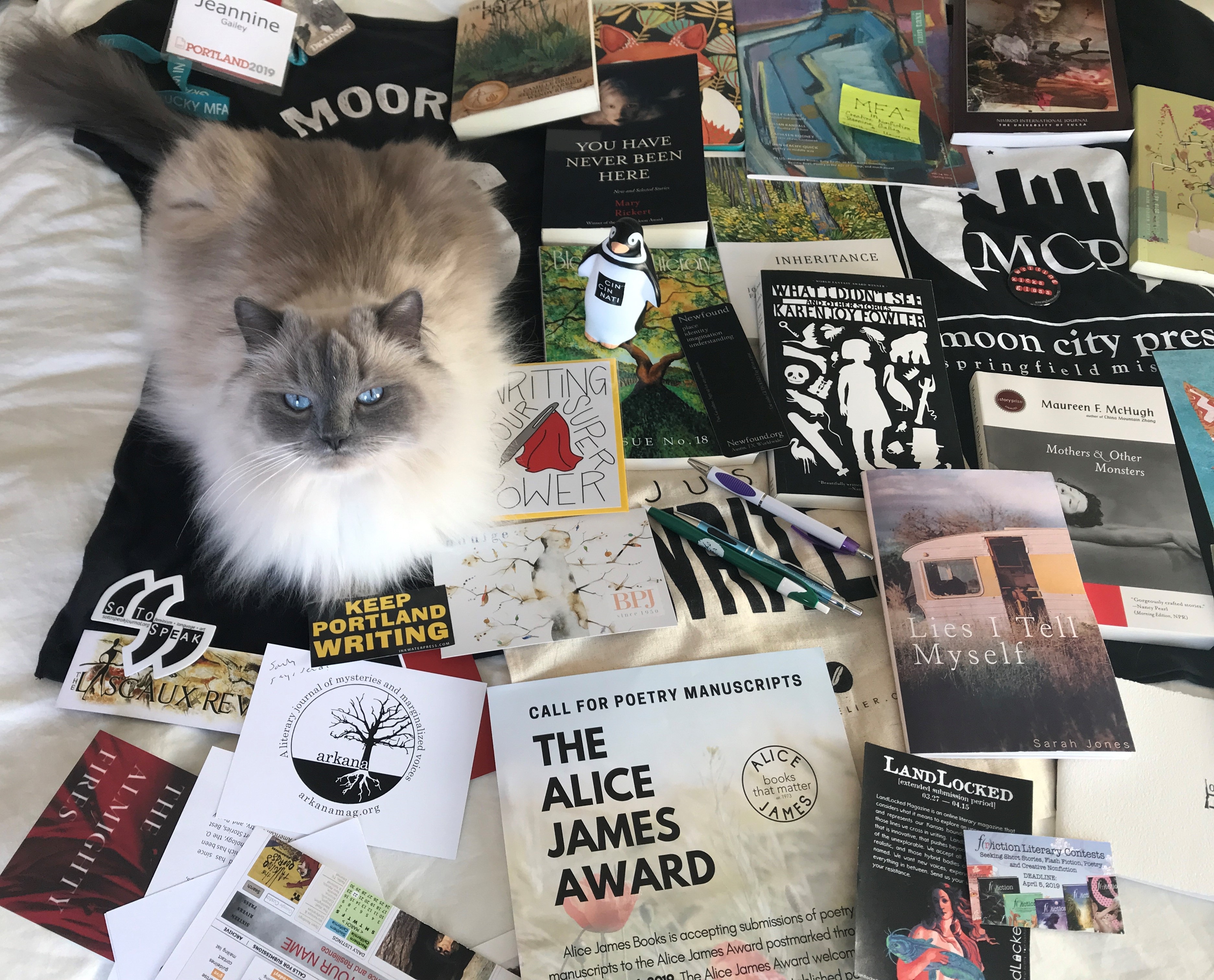 Sylvia, who climbed on top of my pile of AWP swag as soon as I had it out!