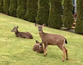 It’s a rough day for a lot of us, so I’m starting out with gratuitous pictures of cute kittens and a family of deer, both courtesy of my “cheering myself up while I’m home sick” photography yesterday. Notice the kitten cheerfully ensconced on my pillow with my box of tissues at her feet; the mother deer was giving her two babies a bath in the rain when I took this picture.