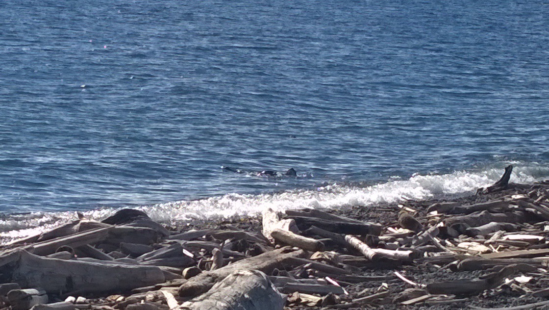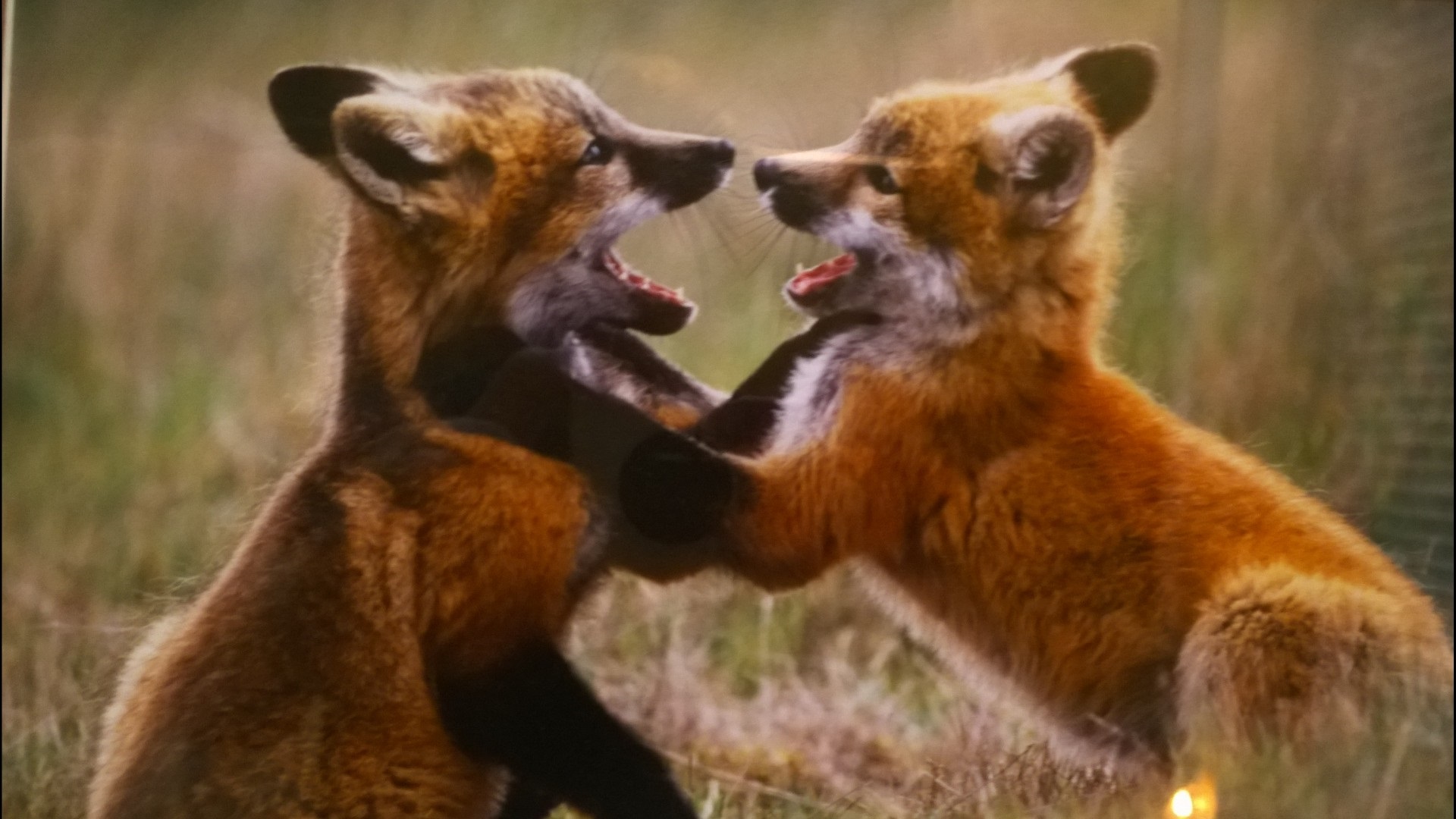 Wildlife sightings: two golden eagles swooping overhead, on opposite sides of the island; one black fox and lots of large rabbits, several otters, including a baby who was chirping because he was left behind his faster family. This was our last visit to American Camp beach, and I was happy to go clomping along the driftwood and sand with my cane (!!) because I got to see some otters frolicking along the waterline. It was raining heavily til about 2 PM, when a little sunlight squeaked through. Of course the deer were out and about as usual. Of all these, I only got a snap of the otters in the ocean at play. I’ve also included a picture of some art from our cabin – photograph of fox kits.