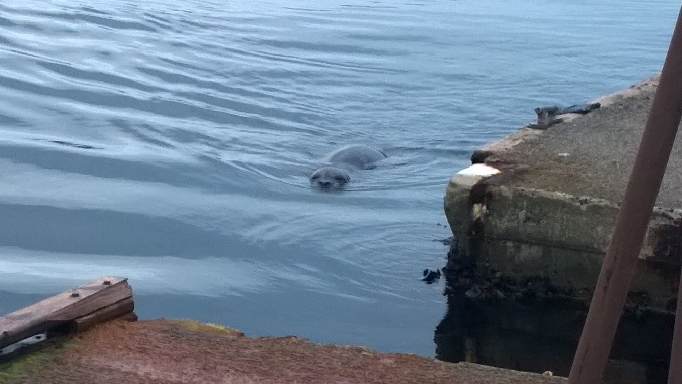 I slept in today as we were without internet until later in the afternoon, and didn’t feel very energetic anyway, plus it was drizzling outside. In the late afternoon we made another trek to Lime Kiln Point, this time empty of whales or porpoises, but we did run into our white-tipped black fox friend there again in a totally different part of the park. Then we came home and waited on the dock for our seals. Glenn got very close to this one, who, in Glenn’s opinion, was breathing heavily at him. The whole day was a bit dreary but that was fine – I think I was tired out anyway since we were up past 2 AM last night waiting for our sheets to get dry after the power outage.
