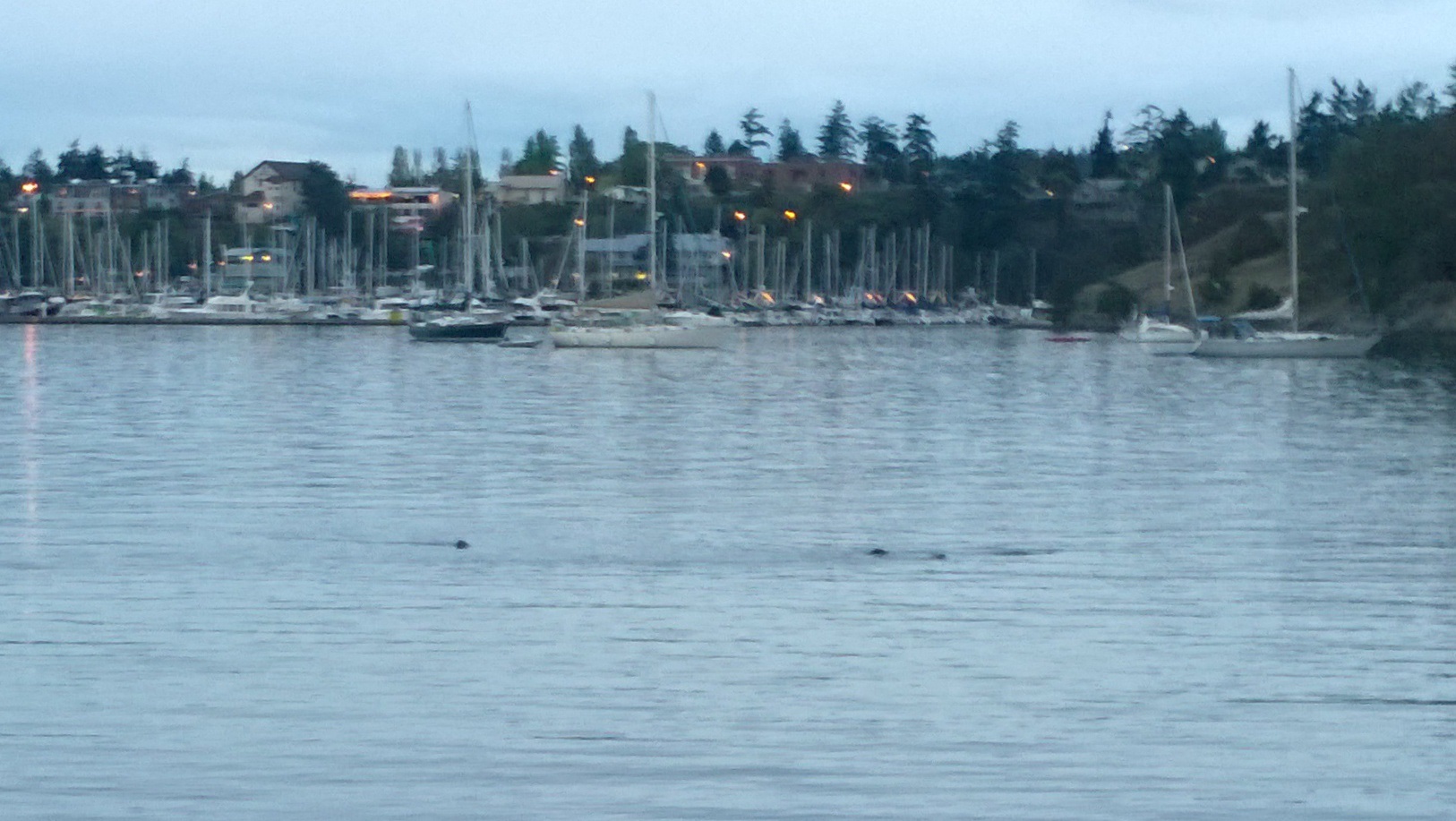 This evening we decided to seal-watch rather than whale watch as the sun went down , down the dock where the UW center does its marine biology research, and watched four seals follow each other around, poking their heads and splashing around while we vainly tried to get a picture to do them justice. We were also being harassed by a kingfisher who kept chittering and flittering over our heads, a very busy kingfisher, we thought, until we noticed there were a pair of them! The deer are also thick on the grounds of the Whiteley Center, mostly around the parking lot, one of them even scaring Glenn off the path to our cabin late at night! Gotcha, says the deer!