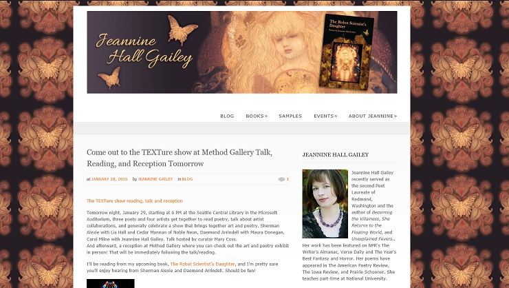 And, once again, my husband Glenn, my little brother Mike, and I have endeavored to go in and mess around with the web site. We’ve changed hosts, updated all the WordPress widgets (and, well, after two years, they were almost all broken) and updated with new graphics (thanks to my sister-in-law Jen Gailey and my book’s cover artist Masaaki Sasamoto.) Here’s a screen shot of the new look. Let me know what you think!