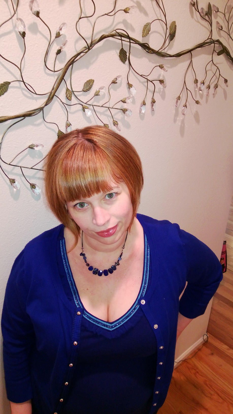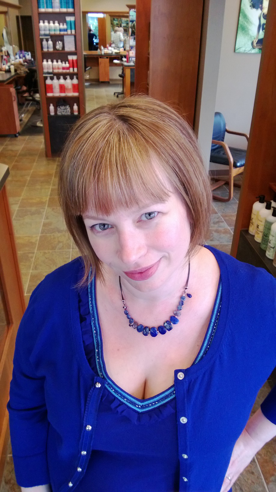 Last night I went to a really fun poetry reading where I got to hear from Marge Manwaring’s new book and work by Ron Starr, and got to hang out with a few friends afterward, had a long phone conversation with a good friend in medical school – and had one of those spur-of-the-moment, embrace-change haircuts! (Razor-cut asymmetrical bob.) I also colored my hair much, much blonder. It felt good to do something different. That’s right, people – I don’t want to be a walking cliche, but when you have the blues, go blonde! I mean, what can it hurt? (PS my blonde is always a bit strawberry, because I really can’t get rid of the red in my hair no matter what color I mean to color my hair. “Chocolate brown/mocha” ends up auburn, so “light brown/dark blonde/caramel/honey/almond” ends up strawberry. By the way, notice how many of those words involve food – is someone going to be eating our hair? Right? Gross!) I know I’m being a total junior high girl and posting pics of the hair. (I did it on Facebook too! Crazy!)