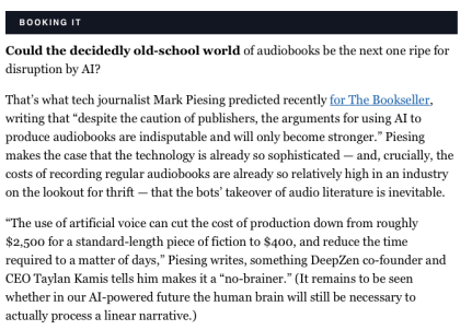 The Guardian published this comment piece Why AI audiobook narrators could win over some authors and readers, despite the vocal bumps