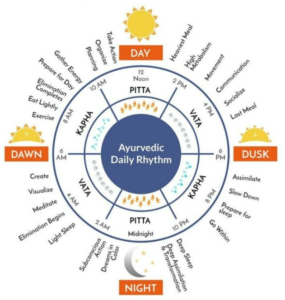 Morning (6 AM to 10 AM – Kapha Time): The day begins with the Kapha period, characterized by qualities of heaviness and slowness. It’s a time when the body’s energy is more relaxed and calm. This is the ideal time for gentle awakening, stretching or light exercise, and planning your day. The Kapha influence makes this time perfect for grounding activities before the day’s hustle starts.Late Morning to Afternoon (10 AM to 2 PM – Pitta Time): As the sun climbs higher, Pitta takes over. This dosha is associated with heat, intensity, and digestion. It’s when our digestive fire (Agni) is at its strongest, making it the best time to have the largest meal of the day. Pitta time is also when you’re likely to be most focused and productive, so it’s ideal for tackling challenging tasks or making important decisions.Late Afternoon to Early Evening (2 PM to 6 PM – Vata Time): During this period, the airy and mobile qualities of Vata dominate. It’s a time of mental alertness and creativity. This is the perfect period for brainstorming sessions, creative endeavors, and intellectual activities. It’s also a good time to enjoy a light snack to keep your energy levels up.Evening (6 PM to 10 PM – Kapha Time Again): As the day winds down, we re-enter a Kapha period. This is a time for slowing down and preparing for rest. It’s ideal for gentle, relaxing activities like reading, spending time with family, or gentle yoga. Eating a lighter dinner during this time can aid in digestion and promote better sleep.Night (10 PM to 2 AM – Pitta Time Again): Pitta governs again, but this time it’s not about physical digestion, but rather mental and emotional processing. This period is crucial for sleep, as the body heals, detoxifies, and rejuvenates. Being awake and active during this time can lead to imbalances.Early Morning (2 AM to 6 AM – Vata Time Again): In these early hours, Vata’s qualities of movement and alertness return. This time is considered ideal for spiritual practices like meditation or yoga, as the mind is said to be most receptive and the world around us is still and quiet.By aligning your daily activities with these cycles, you’re more likely to maintain a natural balance, leading to improved physical health, mental clarity, and overall well-being. This rhythm honors the natural ebb and flow of energy within us, helping us to live in harmony with nature’s inherent wisdom.