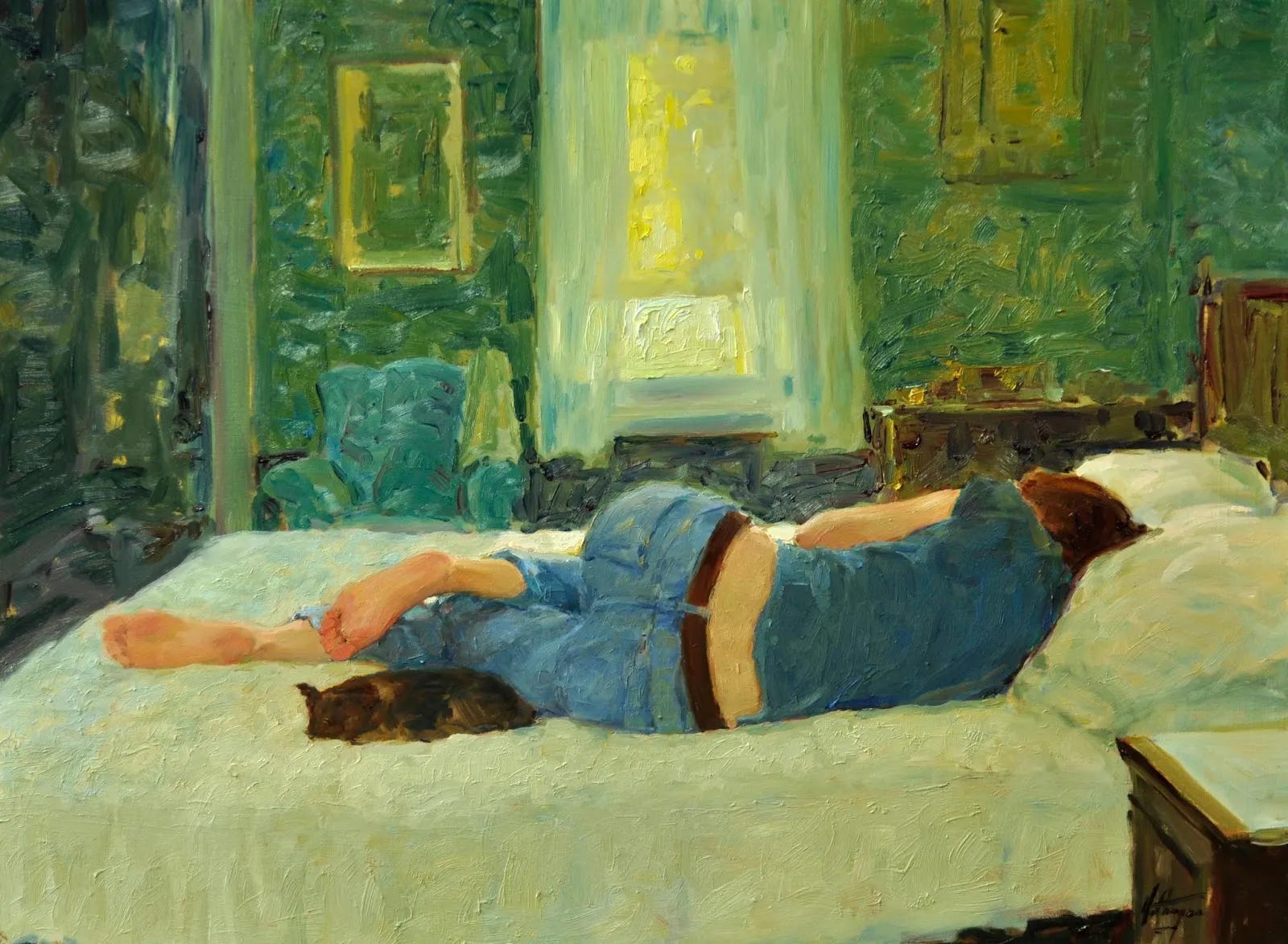 A Break in Their Day (1946), David HettingerMe revuelvo en la cama de un lado a otro como si luchara contra algo invisible, a tientas, forcejeando con los envites de la vida. En realidad es el calor que no me deja dormir. Pasan las horas y sigo dando vueltas, pensando en lo que no quiero pensar, obligado a mirar a un punto fijo como una especie de castigo divino. Después de la tortura psicológica concilio al fin el sueño, pues ya no me quedan fuerzas contra las que rebelarme. Por el día la sensa...