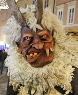 In Austria, 'Krampus night' is December 5, or St. Nicholas eve. One of the ways to witness the spectacle is to attend a Krampuslauf or 'Krampus run'. You remember Krampus, according to folklore he is the devilish sidekick of St. Nicholas, and his duties include throwing naughty children into a sack or basket, beating them with a whip, and carrying them off into the night.