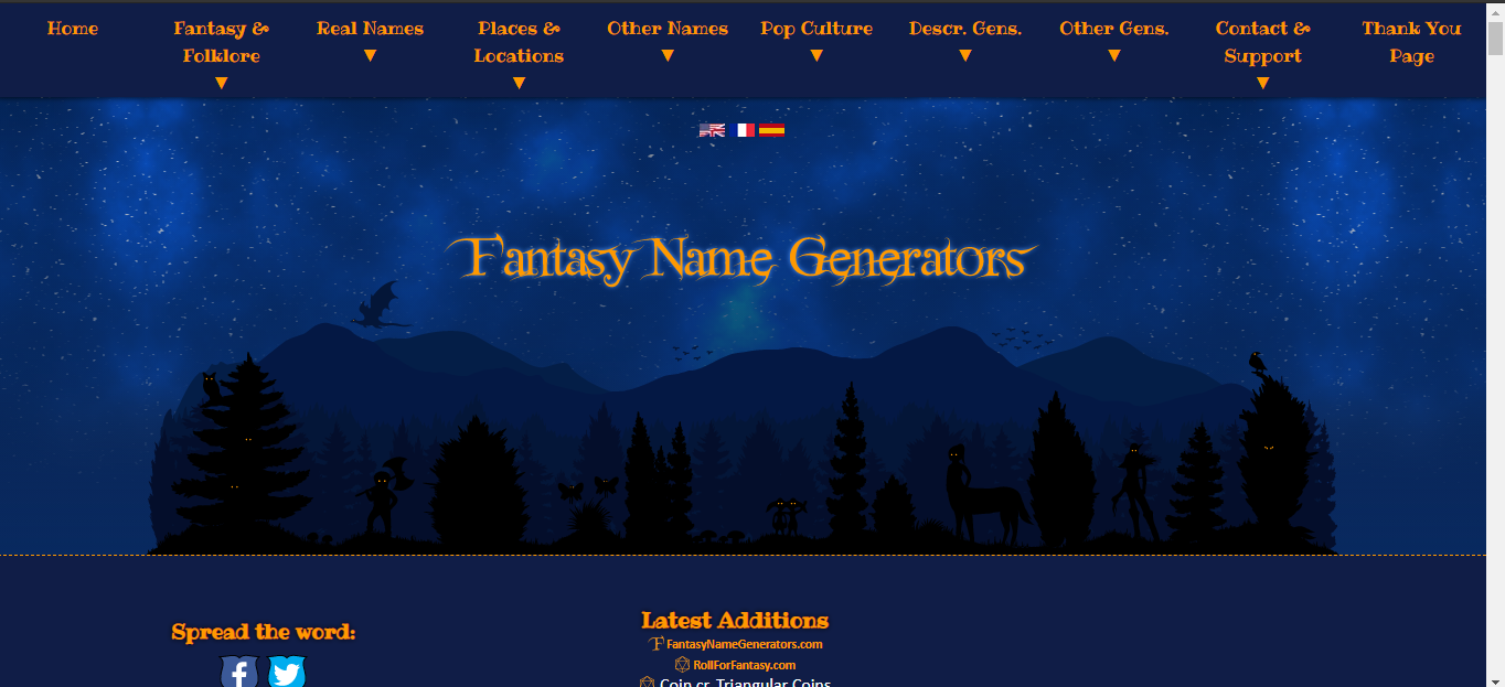 Es una página que te genera nombres fantasiosos para tus libros de fantasía, también nombres reales, nombres de lugares, otros nombres y nombres de cultura pop; es decir, tipo nombres de personajes como Pokemón y otras carícaturas o animes que ya existen y tiene infinidad de temas para conseguir nombres. Y no solo eso tiene este sitio, sino que también, cada vez que utilizas 5GB de esta página o estás utilizántola como también ves los anuncios, estarás aportando a la donación de plantación árboles que el creador hace junto a la fundación Eden Reforestation Projects y dándole clic pueden saber más sobre esta buena causa.