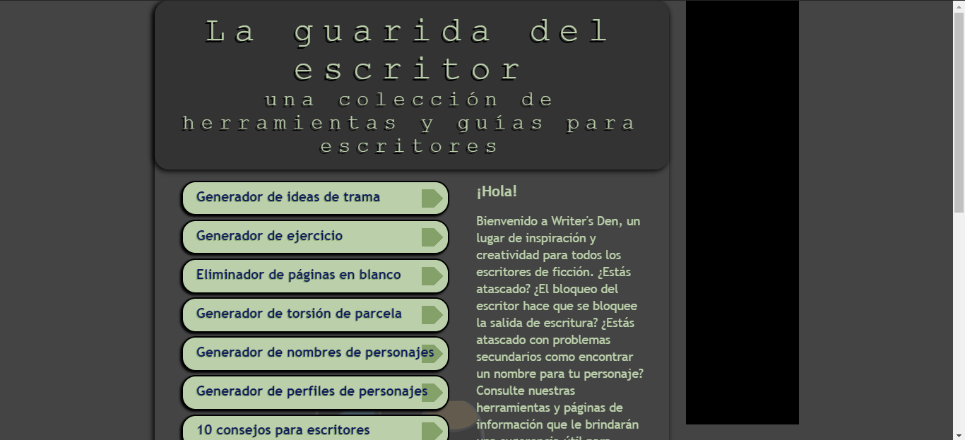 Esta es una de las p��ginas que todo escritor debe conocer porque te da ideas al azar; ya sea que te genera tramas para tu historia, ejercicios, tales como: Escribe un relato que contenga la siguiente oraci��n...; generador de torci��n de parcela, es como dar un giro inesperado en la historia; generador de nombres y perfiles de personajes; generador de primera l��nea y de ubicaci��n; y por supuesto, te da 10 ideas para escritores y c��mo ser un buen escritor.