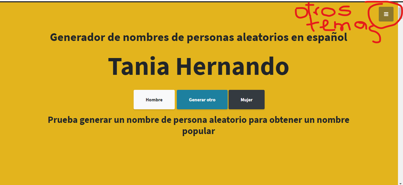 Esta es una p��gina que al entrar te presenta ya un nombre que podr��as usar para un personaje, pero te da la opci��n de cambiarlo, escogiendo los cuadros donde dice "Hombre" o "Mujer" o "Generar Otro". Esta p��gina te da nombres aleatoreamente. Te permite cambiar por pa��ses, tambi��n puedes poner nombres de empresas, nombres para instagram y otras cosas m��s. Es una p��gina excelente y completa.
