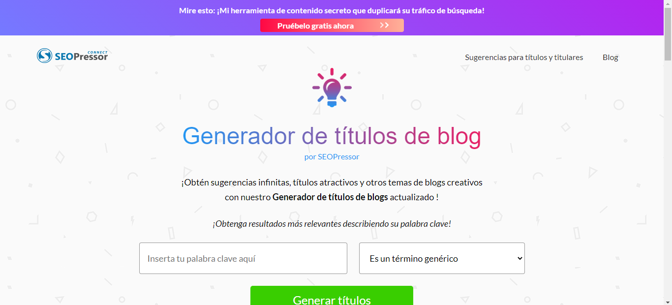 Este sitio es un tanto parecido a Crear T��tulos y SEOpressor, pero la diferencia es que te crea t��tulos para posts, podcasts, ideas descargables, ideas para videos con la palabra clave que colocas al principio y lo bueno es que tiene la opci��n de copiar y actualizarlo por si no te parece esos t��tulos que te gener�� y tambi��n te comparte ideas, gu��as y consejos para utilizar en tus proyectos y mejorar.