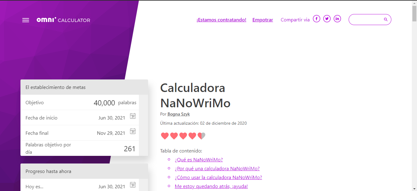 5.OmniCalculator: Este es una página que te indica cuantas palabras debes escribir cada día antes de la fecha que tienes pensado terminar o publicar tu libro. Por ejemplo si tienes que escribir 40,000 palabras para el 29 de noviembre de este año y calculando la fecha en la que estás, pongasmos que empezaste el 30 de junio entonces debes escribir 261 palabras por día para lograr tu objetivo.
