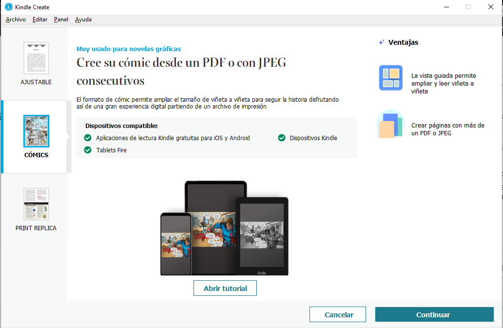 ComicsApto para novelas gráficas. Dentro de este puedes ajustar el tamaño viñeta a viñeta y partiendo también de un archivo de impresión. Para utilizarlo deben subir su manuscrito o comic en formato PDF o con JPEG consecutivos. Si quieres saber m´ás información de cómo utilizar está forma, solamente da clic AQUÍ. En este caso, no necesitas poner un idioma para utilizarlo, eso dependerá de tu manuscrito. Los dispositivos con los que tus lectores podrán leer, son los mismos que con la forma ajustable. En la imagen podrás ver las ventajas de utilizar esta forma.