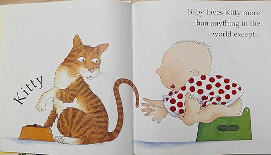 Babies can exude such a simple joy, and Baby Loves captures all the feels throughout a day. Each page features something Baby loves more than anything except . . . we turn the page to see what else baby loves. “Baby loves breakfast more than anything in the world except . . .” and the picture is a big, bright picture of baby with a bowl on his (or her?) head. Turn the page, and we read, “. . . Teddy. Baby loves Teddy more than anything in the world except . . .” Turn the page and we see baby who has loved teddy so much she’s (or he’s) pulled a leg off. Baby and teddy look at us with eyebrows raised, like oops! Makes me laugh every time. So does this illustration:
