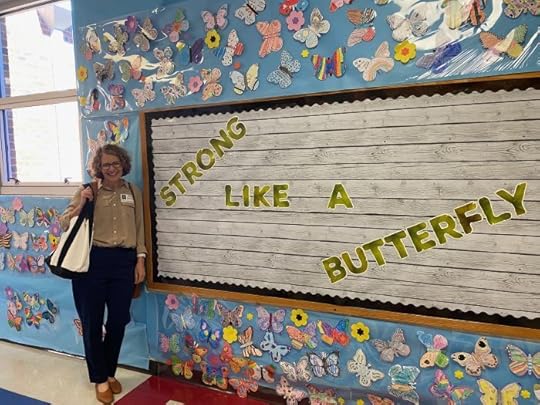 Rebeka may not look strong, perched on top of those curled feet, but she is. But the heart part of that comes when I connect that idea with readers. At school visits, I tell kids you can’t always tell how strong someone is from the way that they look. It’s true for a butterfly, with its delicate wing, it’s true for Rebeka, and it became a rallying cry for all kids to be brave and courageous and strong like butterflies, no matter how they look or feel. I’ve received hundreds of colored butterflies in the mail, and at every school visit they flutter on the walls.