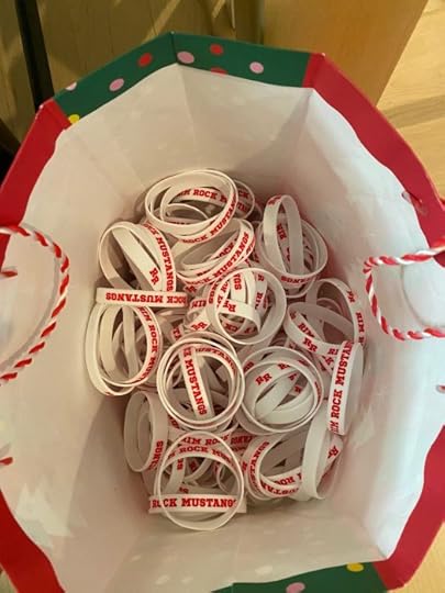When Noah finds out he’s a gravitar, he’s given a bracelet that looks like any ordinary Rim Rock Mustangs rubber bracelet, but it’s not. It’s bugged. And just as an ordinary-looking bracelet can do extraordinary things (like transmit all verbal and written communications), an “ordinary” kid can to extraordinary things. For Christmas, Clay got me a box full of Rim Rock Mustangs bracelets. They’re sitting on the floor by my desk, still in the red and green gift bag.