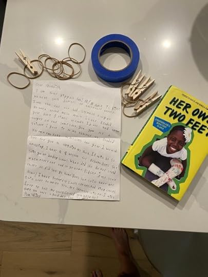 When I shared this post with Riley and her mom, before posting, Riley wanted to tell me “one more thing.” At her school library, Her Own Two Feet is in the “Heroes” section, and she thinks that is the perfect spot for our book. To the librarian who made a spot in the library for books about heroes, and the teacher who read out book to her class, and to Riley’s mom and Grandma who helped her reach out to us, and to Riley who’s sending a roll of tape, rubber bands and clothes pins across the ocean, you are our heroes. Thank you.