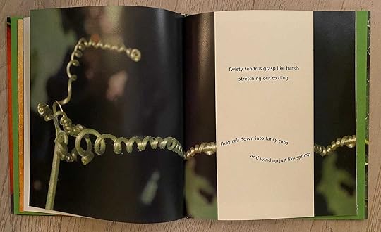 Pumpkin Circle is an ode to the pumpkin, following its path from seeds that reach with “silky roots” to grow a dense patch of leaves and vines. Their “twisty tendrils grasp like hands stretching out to cling. They roll down into fancy curls and wind up just like springs,”