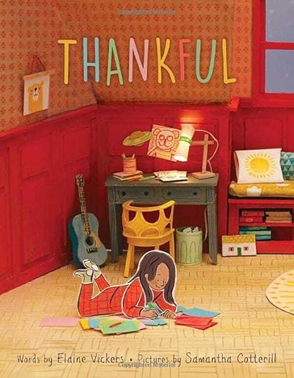 Thankful inspires me with its creative gratitude, “I am thankful for things that are soft and fresh, like laundry, bread, moss on rocks.” It invites us to look closer at our worlds and notice all the little things we are thankful for. Throughout the story a young girl makes her paper chain, writing her gratitudes on each colorful link, illustrated with photos of three dimensional paper sets. It is the perfect mirror, a story about a paper chain illustrated with paper cut-outs, a story that begins with one link and ends with the chain stretched around the girls’ window, ready for her to begin reading the first link the next day. What a wonderful tradition, and a beautiful book.