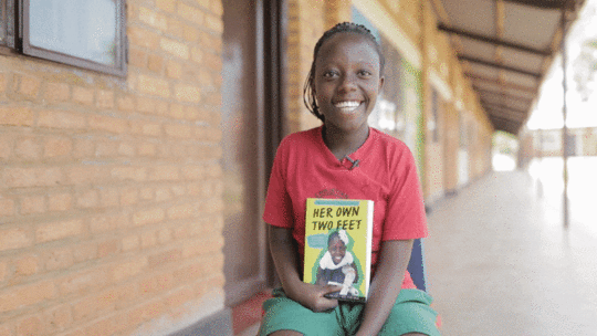 Aliyah reading HER OWN TWO FEET: A RWANDAN GIRL’S BRAVE FIGHT TO WALK