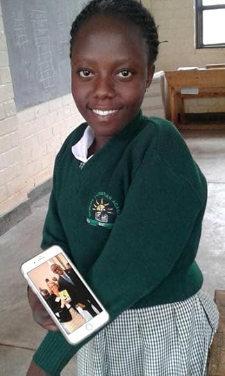 Rebeka holding phone with picture of Meredith and President Paul Kagame