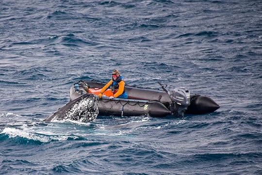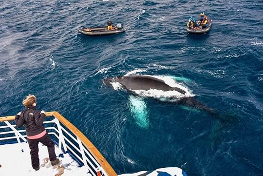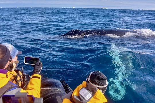 The passengers were divided into five groups, and our group would be last to depart. I glanced out the porthole and noticed a guide in a zodiac floating just outside our room. He was scanning the horizon, and he looked disappointed. I was sure the whales were gone, but then he looked down and started pointing and yelling. A giant black humpback head come up right next to the guide’s zodiac.