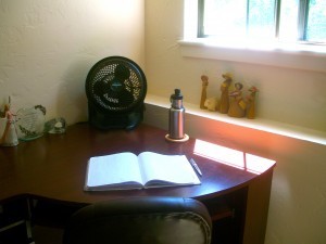 Here is the place I come to write. I concentrate best when my desk is simple and clear with just the essentials– a laptop, headphones, a fan to keep cool, a water canteen, and a few memorable decorative things.