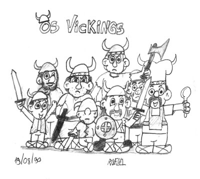 Nessa época eu queria fazer algo tipo Asterix mas era difícil encontrar referências para pesquisa em Rosário do Sul. Só encontrei um verbete de uma página na enciclopédia Delta que só me deixou mais curioso. E na biblioteca do colégio não tinha absolutamente nada sobre os povos nórdicos. Acabei desistindo. Que falta fazia um google em 1990.