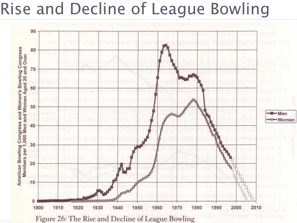 Putnam published his book in the year 2000, now a whole generation ago and prior to the stratospheric rise in social media as a means of communication, Netflix as a ticket to almost unlimited entertainment, and Tinder as a means to a quick hook-up.