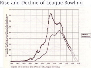 In the years between 1980 and 1993, people stopped doing that. League membership dropped 40 percent in that short period, although bowling itself remained popular.