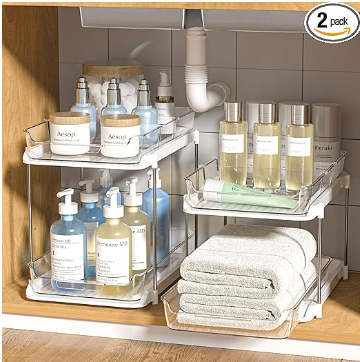 Sets of 2-Tier Multi-Purpose Bathroom Cabinet Under Sink Organizers and StorageStackable Kitchen Pantry Organization and Storage, Pull Out Medicine Cabinet Organizer with 8 Movable Dividers