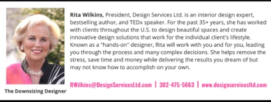 Rita Wilkins Offers Lifestyle Design And Interior Design ServicesDo you want to learn more about downsizing and decluttering? Call Design Services LTD at 302-475-5663 to discuss your design needs. You can also connect with me by following me on Facebook and LinkedIn. Would you like complimentary advice from the downsizing designer? You can schedule a complimentary 30-minute call with me today.