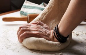 When it’s time to make the pitas, pour 1 tsp of EVOO onto the countertop and smooth it around (It’s fine! Olive oil doesn’t count!) Wipe the excess on your rolling pin. Put a skillet on the stove over medium heat. With your hands, form the dough into a log of whatever size you like, chop it in half, and divide each half into thirds. Wad these into balls—these are your pitas.