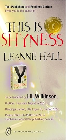 Come see me launch Leanne Hall's astonishing Text YA Fiction Prize-winning debut, This is Shyness. August 12. It'll blow you away. (the book, that is. but I hope to give a good speech as well. plus Leanne's wearing lairy tights and if you're all good then I will also.)