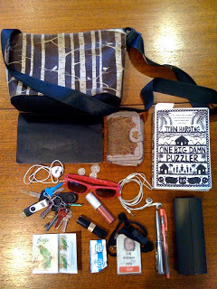 This is actually my standby handbag. My proper one is bigger, but the zip is broken and it is off being fixed.Contents (clockwise from top left):-Moleskine notebook, for writing thoughts-wallet-One Big Damn Puzzler, which is so far a very entertaining read-glasses case (containing reading glasses)-two pens, one pink for signing, one with a sekrit USB stick in the middle.-smartcard for access to work.-Asproclear-iPhone earbuds (the i...