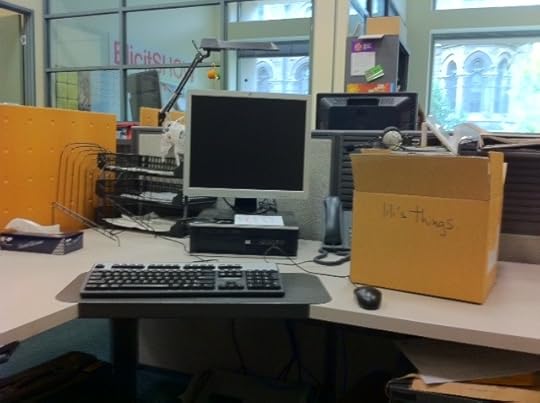 This was my desk at the Centre for Youth Literature. Now it's all packed up, cleaned, with eight years of bits and pieces in one single cardboard box. I thought I'd take you on a tour of that box.