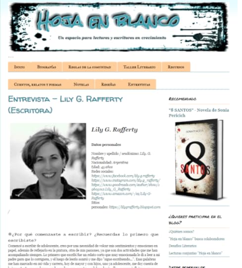 Queridos lectores les quiero compartir esta entrevista que me realizara Sonia para su blog Hoja en blanco" cómo es bastante extensa solo voy a copiarles parte de ella, y como siempre los invito a pasar por el link original para leerla completa.Fue una experiencia muy bonita ya que hemos hablado de muchas cosas, y sobre todo amena y respetuosa.https://hojaenblancotaller.blogspot.com/2020/02/entrevista-lily-g-rafferty-escritora.html