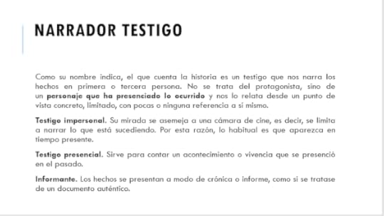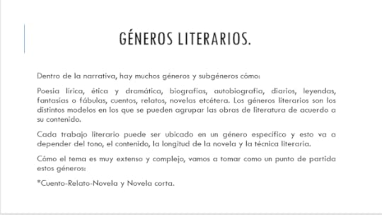 Hoy, quiero compartirles dos links uno es un video que está colgado en mi canal, y en el les voy explicando cada una de las diapositivas y hablo de diferentes temas como: Géneros literarios, tipos de narradores, acotaciones del narrador verbo dicendi y no dicendi, vocativos, que es y cómo puntuarlos, cómo se representan los diálogos y de que manera crear diálogos que funcionen.También un segundo link donde podrán ver la primera parte de la charla que tuvimos ayer con la escritora, Silvina Sant, por Zoom, para que puedan acceder a estos consejos que son muy importantes al momento de decir iniciarse en la escritura, Les dejo aquí las primeras diapositivas para que les resulte más sencillo copiar, en otra entrada les iré subiendo las restantes.https://youtu.be/BJiCnp_tr9Ihttps://y...