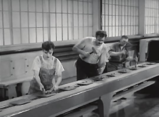 Charles Chaplin estava encenando justamente uma linha de produção mecanizada, nesse período onde o homem era visto como máquina. A ideia era de manter um padrão nesses movimentos para não afetar a linha de produção, fazendo-a fluir num ritmo de produção constante. Fonte da imagem: https://www.researchgate.net/fig…