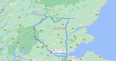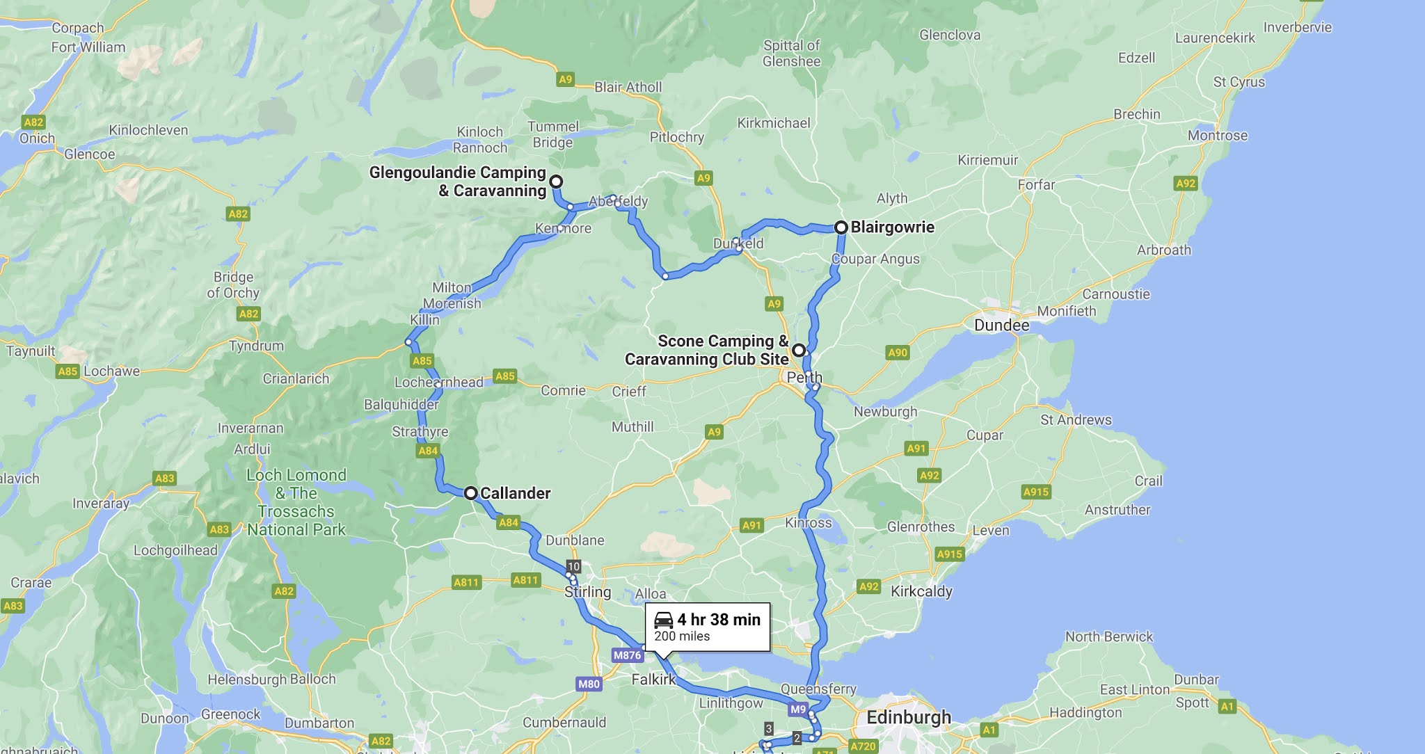 I had the vague notion of wanting to do some hiking this trip, possibly an easier Munro or two (Scottish mountain over 3000 feet), so I researched the route using a combination of booking.com for the hotels, walk highlands.co.uk for the Munros, and pitchup.com and Google for the campsites. The plan was to alternate between two nights in a B&B and two nights at a campsite : total 8 nights.