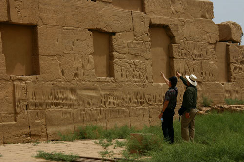 Unfortunately, and not untypically, this fine monument was blown up by a local official, one Mahmud Azmi, in 1897 so that the blocks could be used to construct a new staircase for the local police station and, needless to say, one also for his own house. What remains today is the stump of a wall from the sanctuary which never the less is richly decorated with scenes of Wenamun, Libyan feather in hair, kneeling before Amun and with a procession of deities behind him. The two temples of Aghurmi and Umm Ubayda are connected by a ceremonial way and probably functioned under a single administration, given the isolation of their setting.