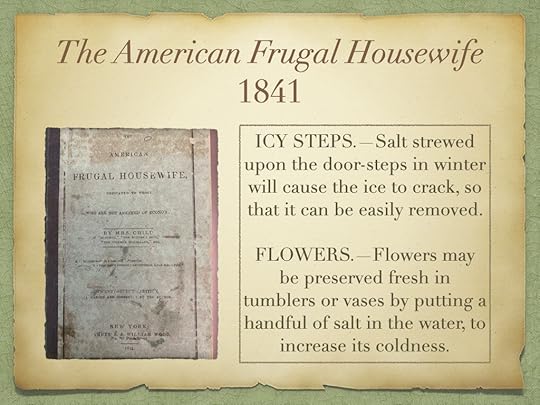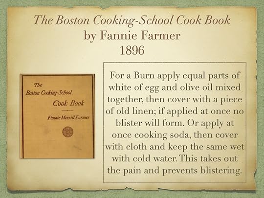 The sixth slide, a quote from Fannie Farmer’s Boston Cooking-School Cookbook (1896), inspired a scene in my book: