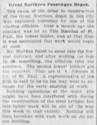 Spokesman-Review 18 Apr 1901“The cause of the delay in construction of the Great Northern depot in this city was explained yesterday by one of the visiting officials. Over a month ago the contract was let to Tim Riordan of St. Paul, the lowest bidder, and at that time it was announced that work would begin at once.… Mr. Riordan failed to enter into the formal contract, and after waiting for him to do something, the officials relet the contract. The second lowest bidders got the contract. They are G.A. Johnson and Co. of St. Paul. A representative of the firm is said to be on his way west to arrange for the early starting of work.… Building operations at the depot site might have been interfered with during the construction of the steel bridges, but this latter work will be out of the way this week in that vicinity. Nothing will then interfere with rush work on the depot building.”
