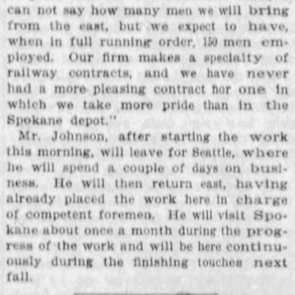 “Charles S. Johnson, the Chicago contractor, who is building the Great Northern depot in this city, arrived in Spokane this morning. He is stopping at the Spokane.”